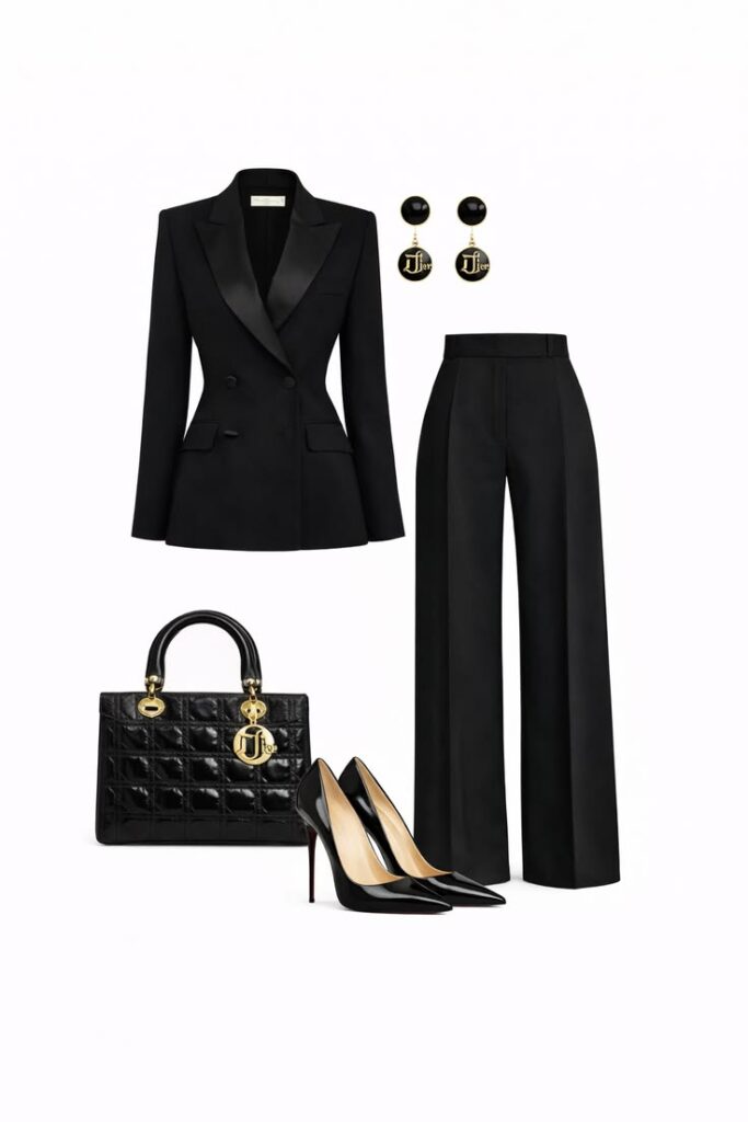 Un ensemble chic et intemporel composé d’une veste cintrée structurée et d’un pantalon fluide à la coupe moderne. Associé à des escarpins vernis, un sac matelassé noir et des boucles d’oreilles dorées, ce look incarne l’élégance et le raffinement pour une allure sophistiquée en toute occasion